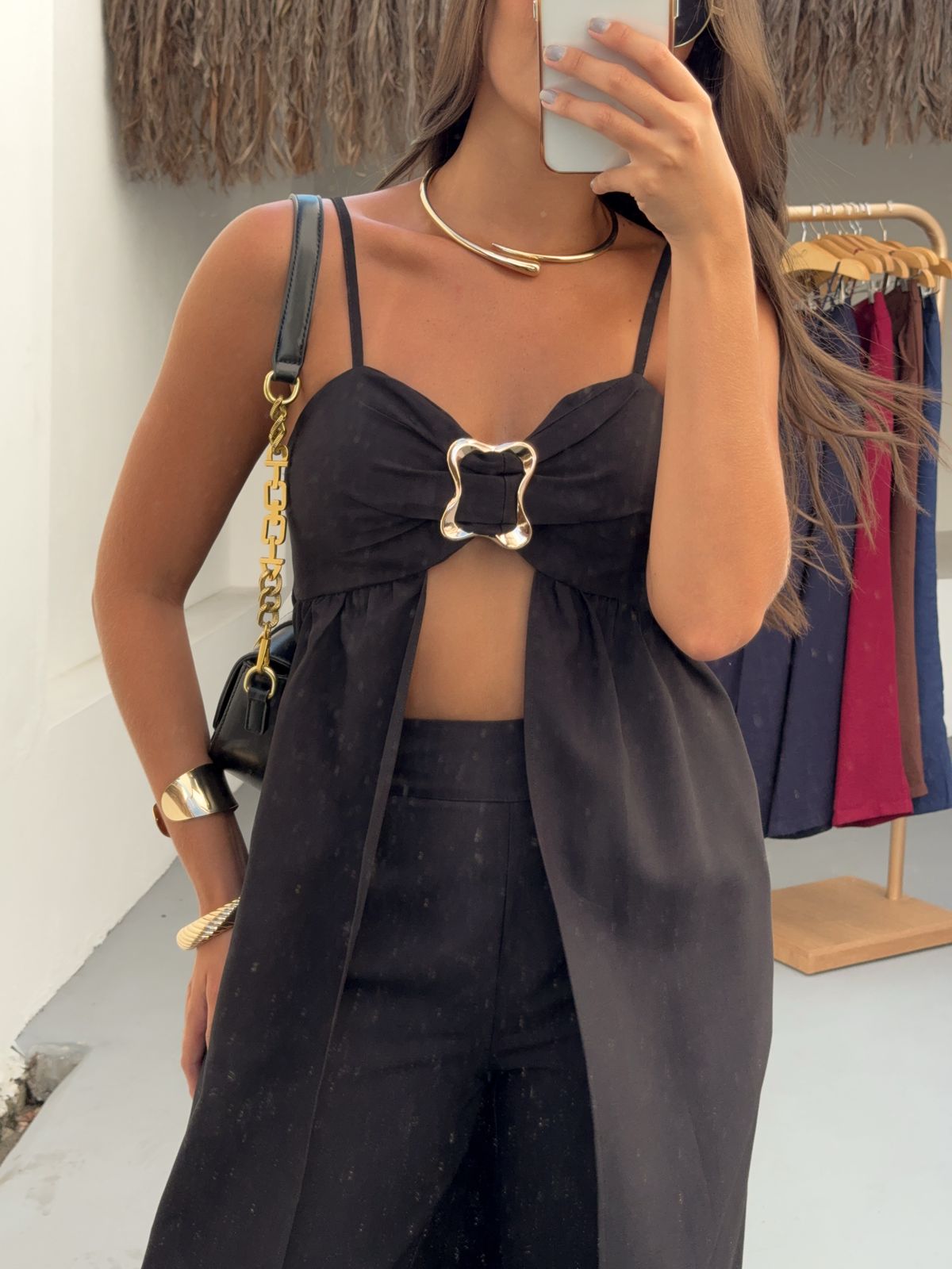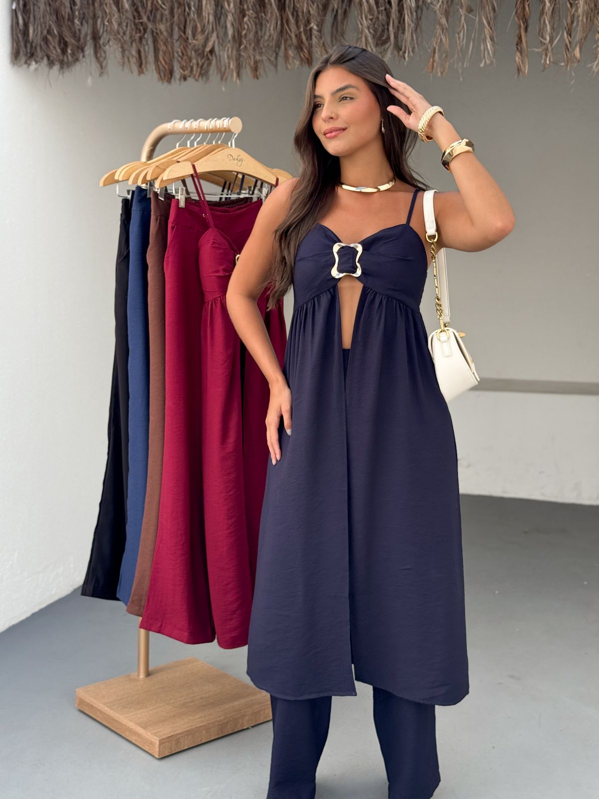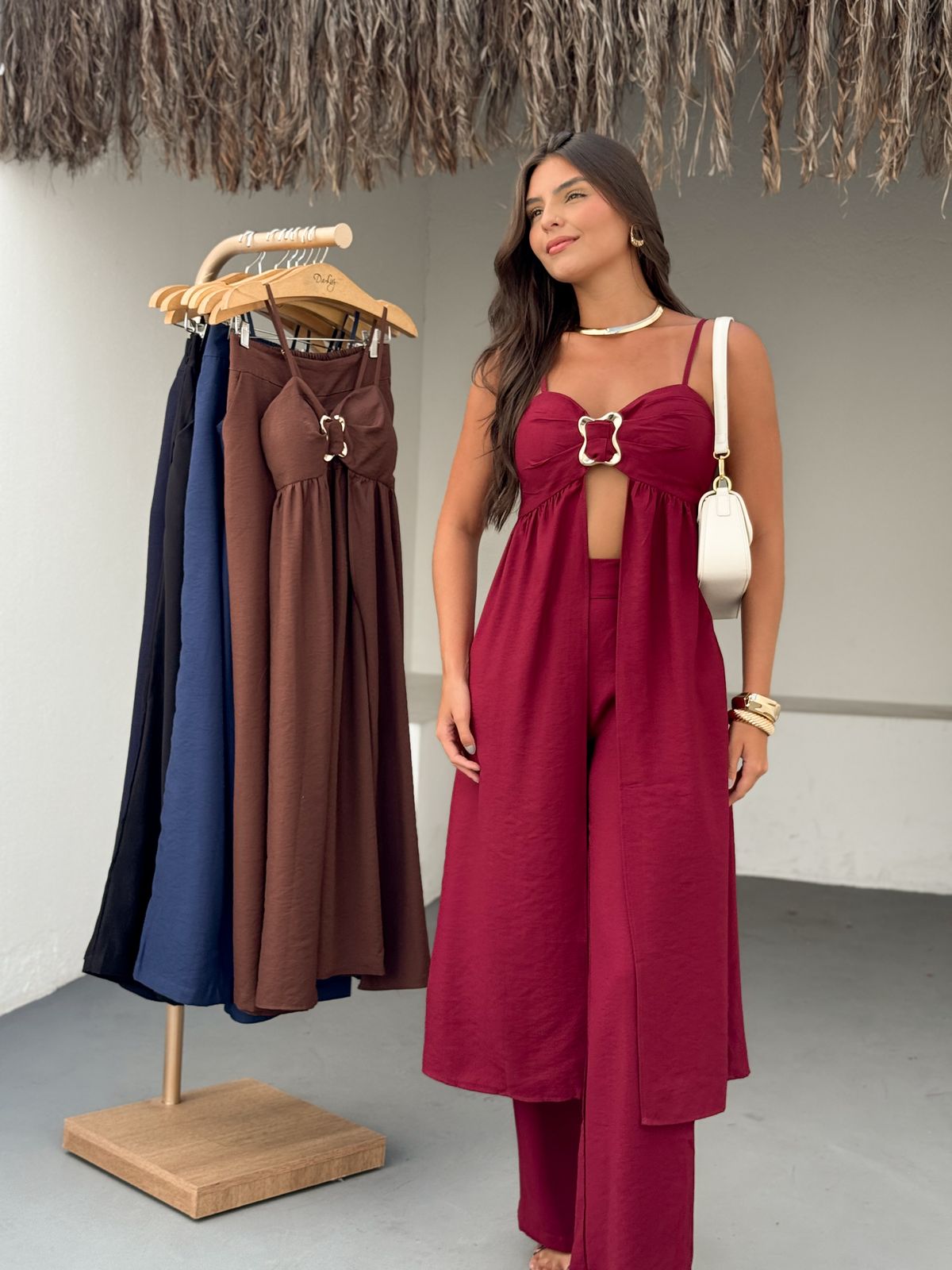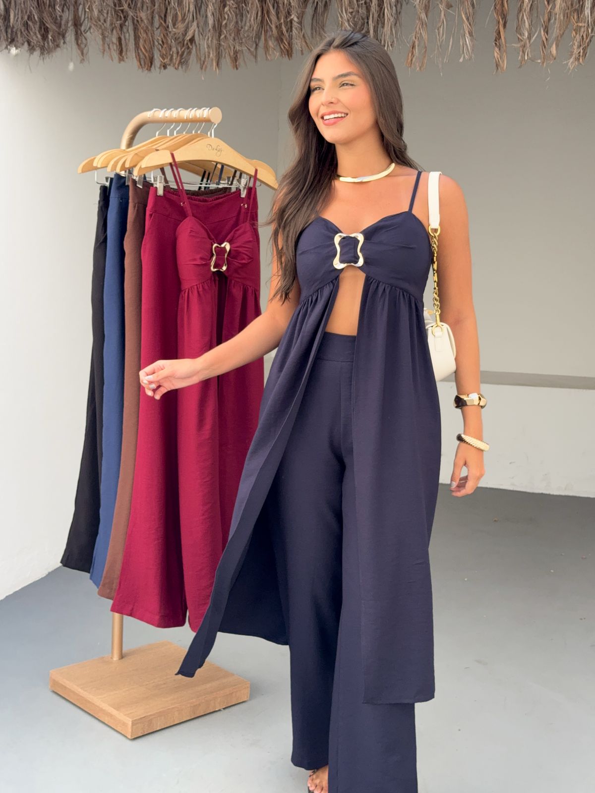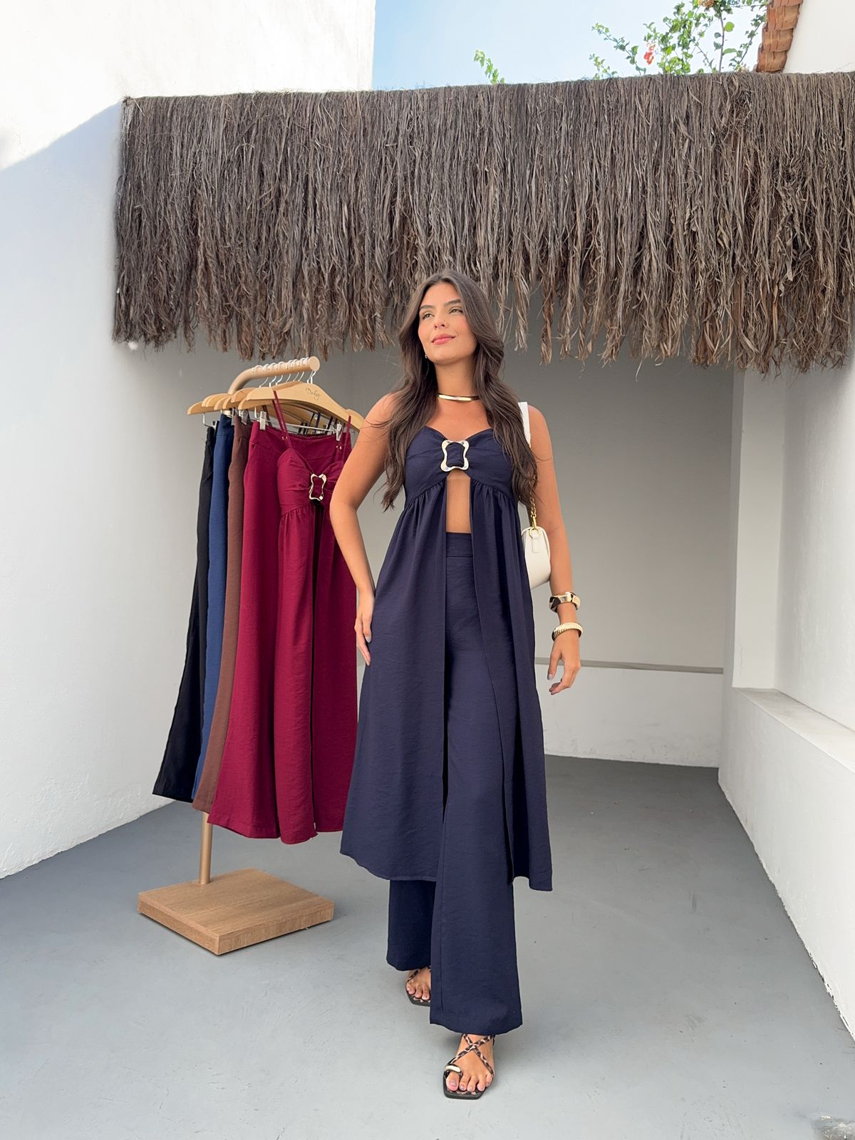 Raggiungi nuovi livelli di eleganza e audacia con il Completo Coliseo. Il top con cut-out e fibbia gioiello aggiunge un tocco sexy e sofisticato, mentre i pantaloni ampi esaltano la silhouette. Un look monocromatico che emana sicurezza e si adatta alle donne che osano con classe. Disponibile in colori decisi e intensi per rappresentare la tua energia.