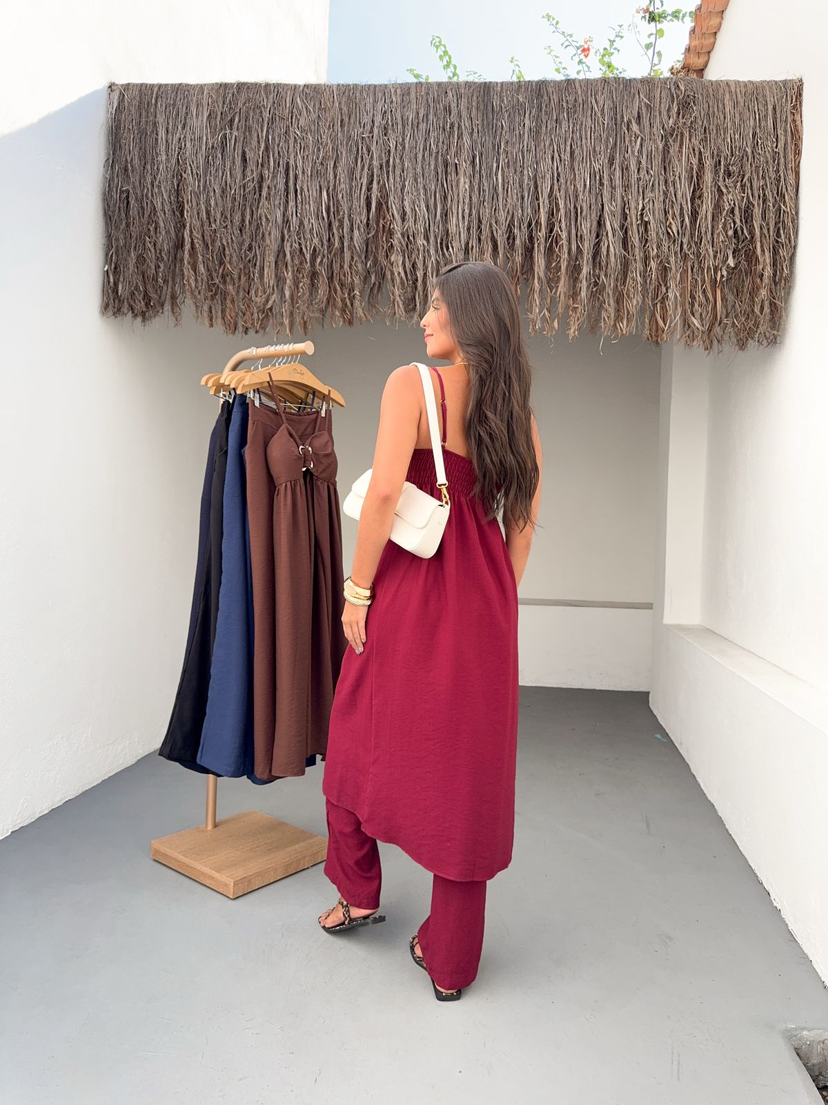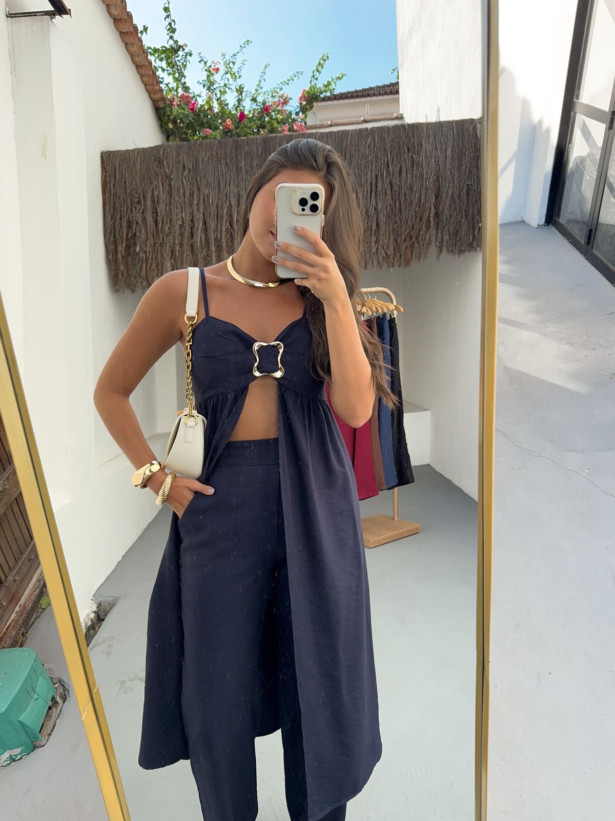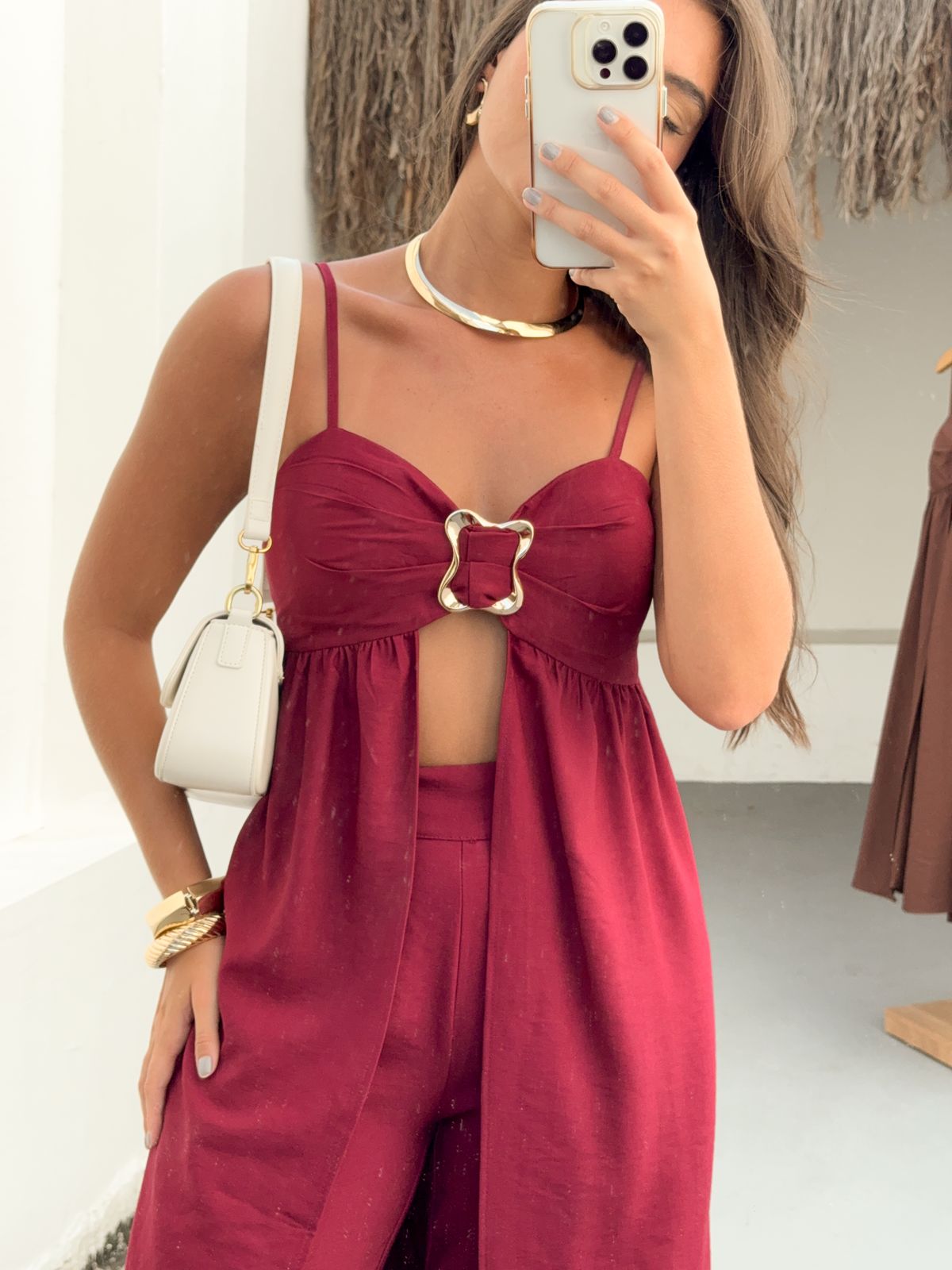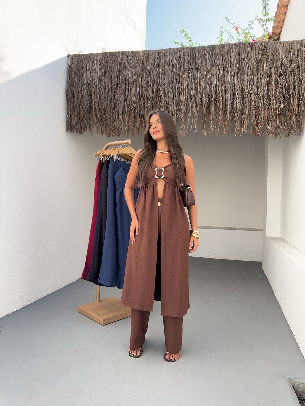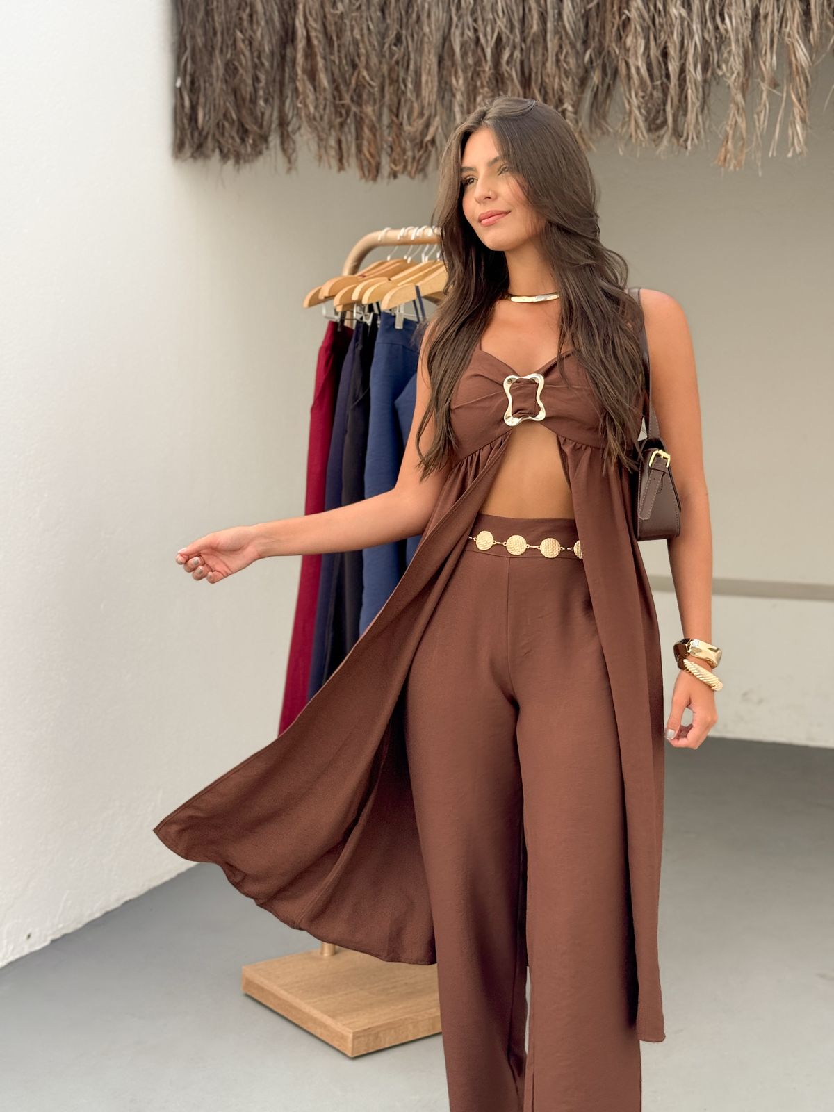 Raggiungi nuovi livelli di eleganza e audacia con il Completo Coliseo. Il top con cut-out e fibbia gioiello aggiunge un tocco sexy e sofisticato, mentre i pantaloni ampi esaltano la silhouette. Un look monocromatico che emana sicurezza e si adatta alle donne che osano con classe. Disponibile in colori decisi e intensi per rappresentare la tua energia.