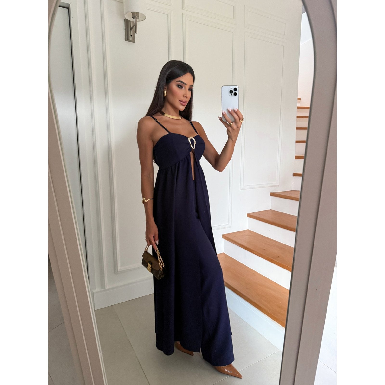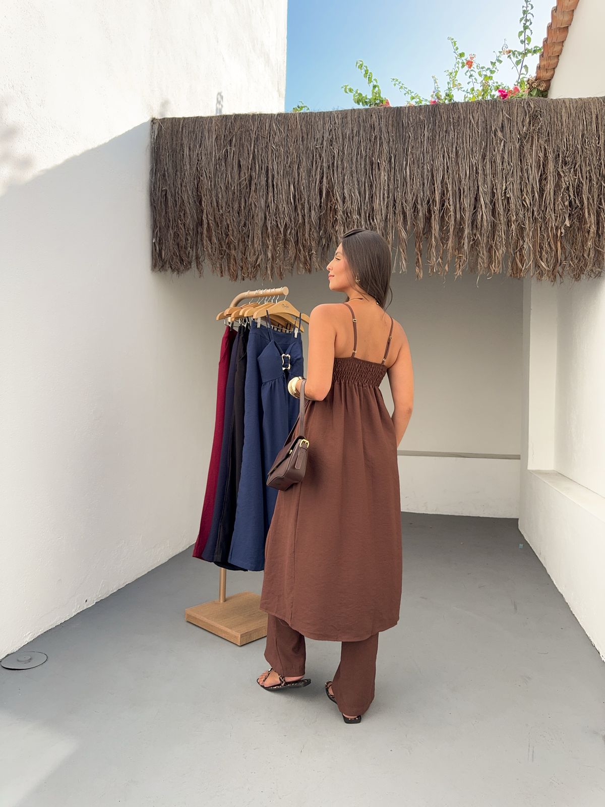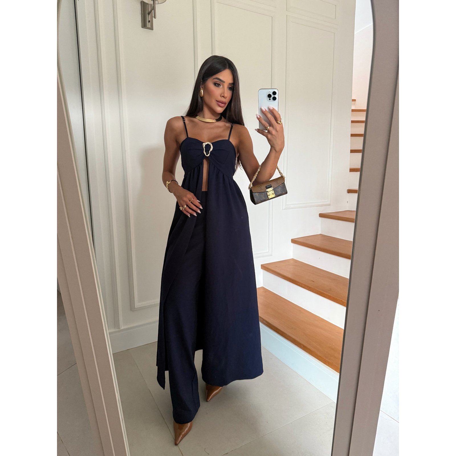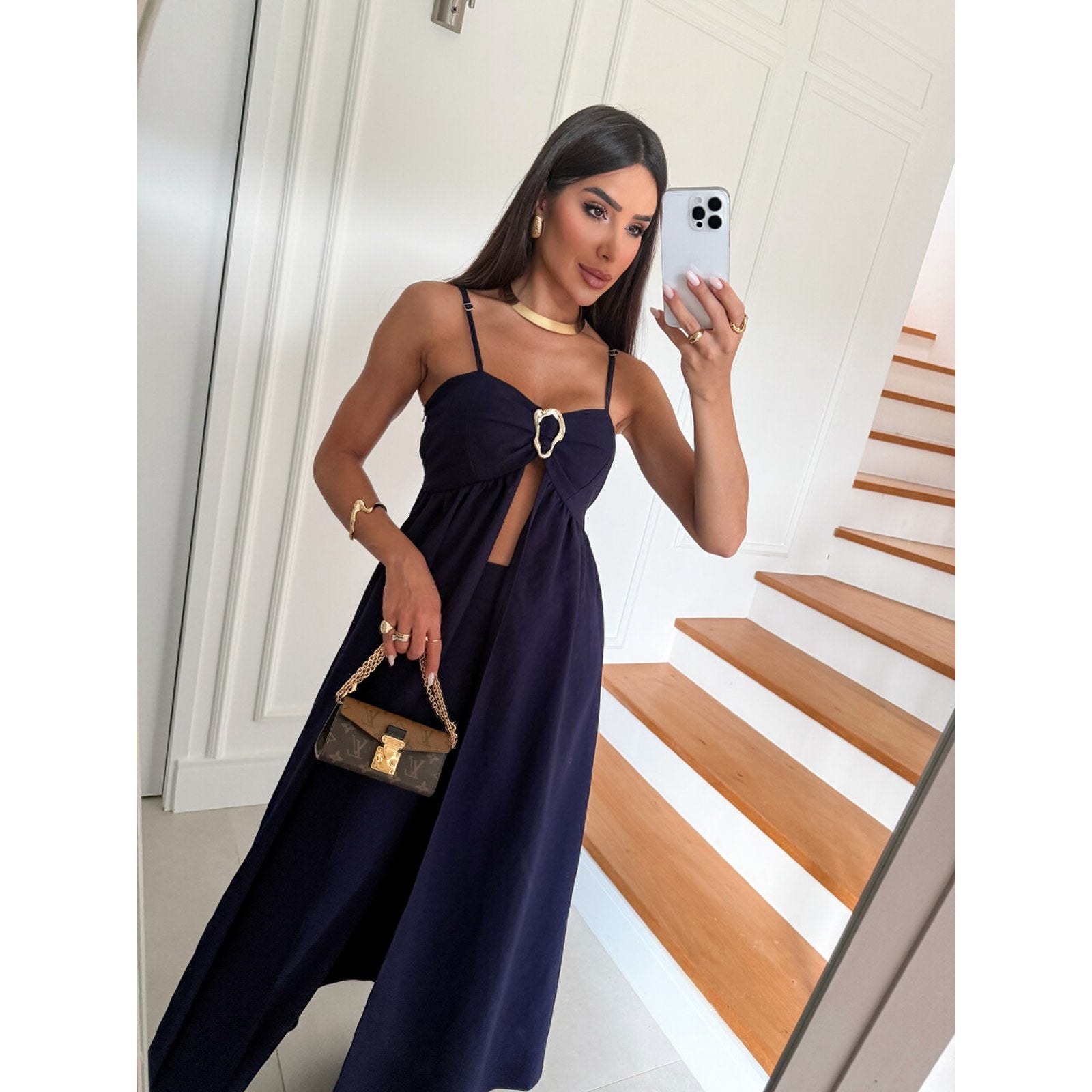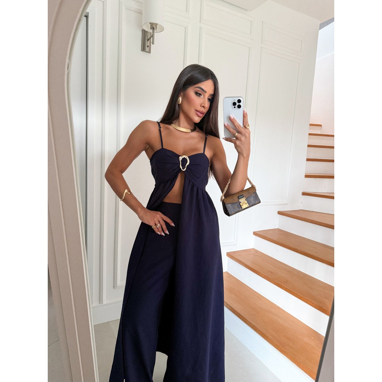 Raggiungi nuovi livelli di eleganza e audacia con il Completo Coliseo. Il top con cut-out e fibbia gioiello aggiunge un tocco sexy e sofisticato, mentre i pantaloni ampi esaltano la silhouette. Un look monocromatico che emana sicurezza e si adatta alle donne che osano con classe. Disponibile in colori decisi e intensi per rappresentare la tua energia.