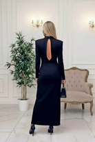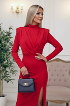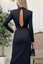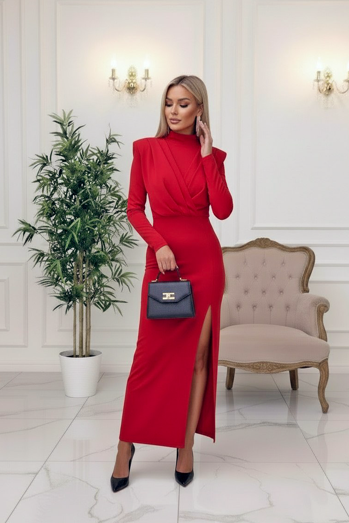 Realizzato in tessuto fluido e strutturato, presenta maniche lunghe, spalle leggermente imbottite per un effetto couture e una schiena parzialmente scoperta che dona un tocco di fascino discreto. Lo spacco frontale allunga la figura, creando un equilibrio perfetto tra eleganza e audacia.