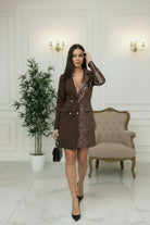 Realizzato in effetto giacca, questo abito presenta una metà decorata con paillettes scintillanti che catturano la luce, creando un contrasto affascinante con il resto della silhouette.