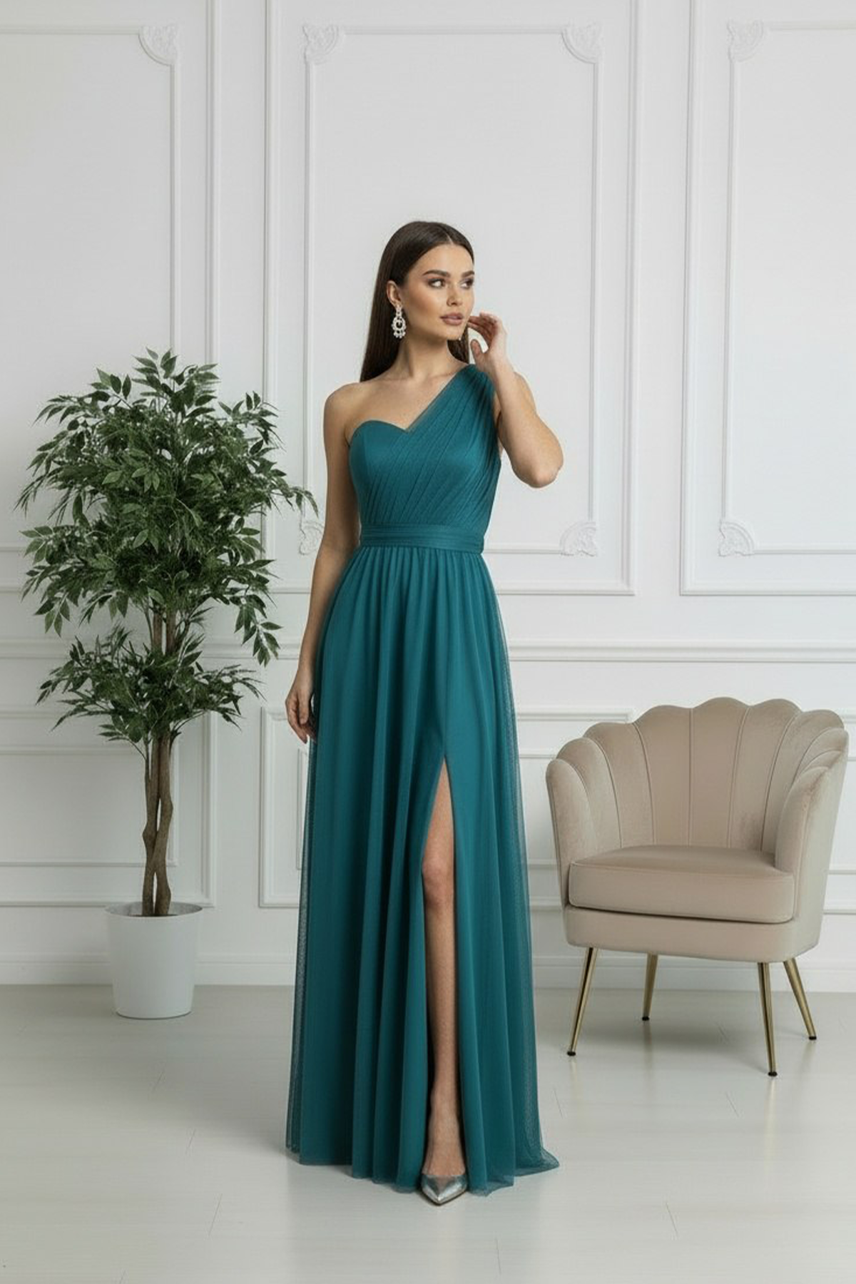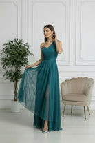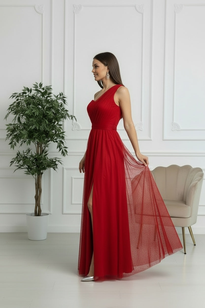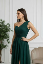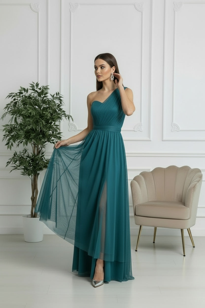 Questo raffinato modello monospalla in tulle cattura l'essenza della femminilità sofisticata. La spalla scoperta crea un effetto sensuale, mentre il tessuto fluido garantisce movimento naturale e comfort durante la serata. Perfetto per matrimoni, gala e occasioni speciali dove desideri fare un'impressione indimenticabile. Un capolavoro di stile che trasforma ogni momento in un'occasione memorabile.