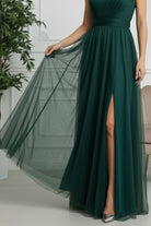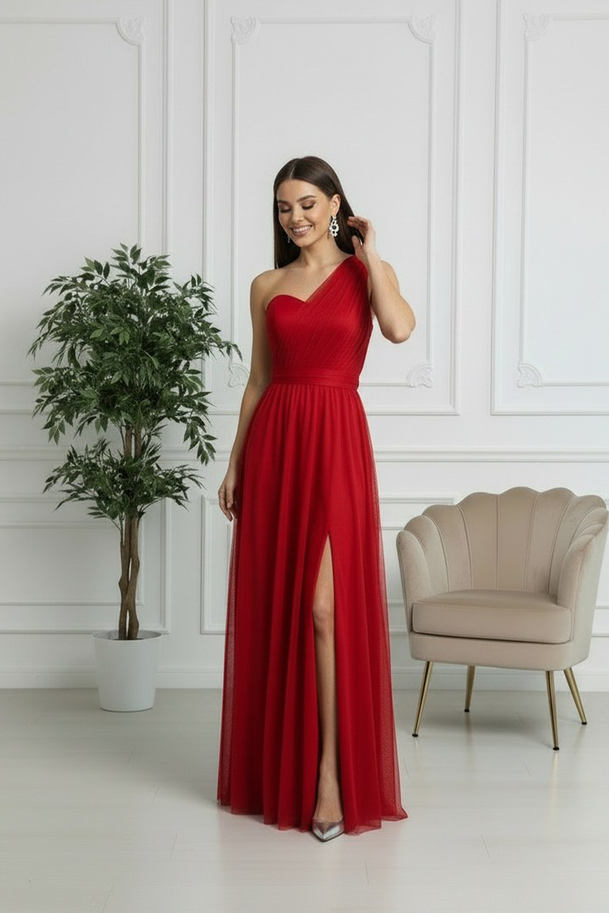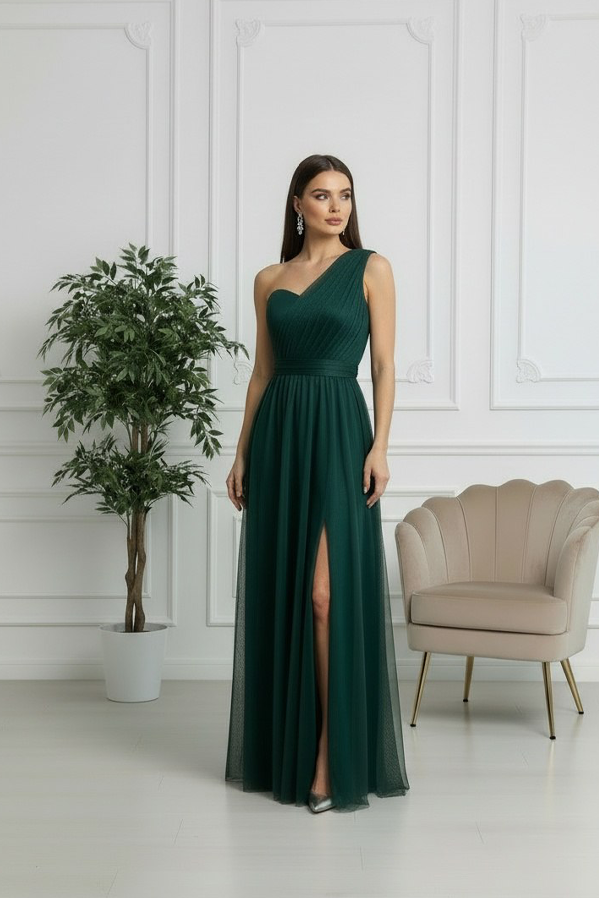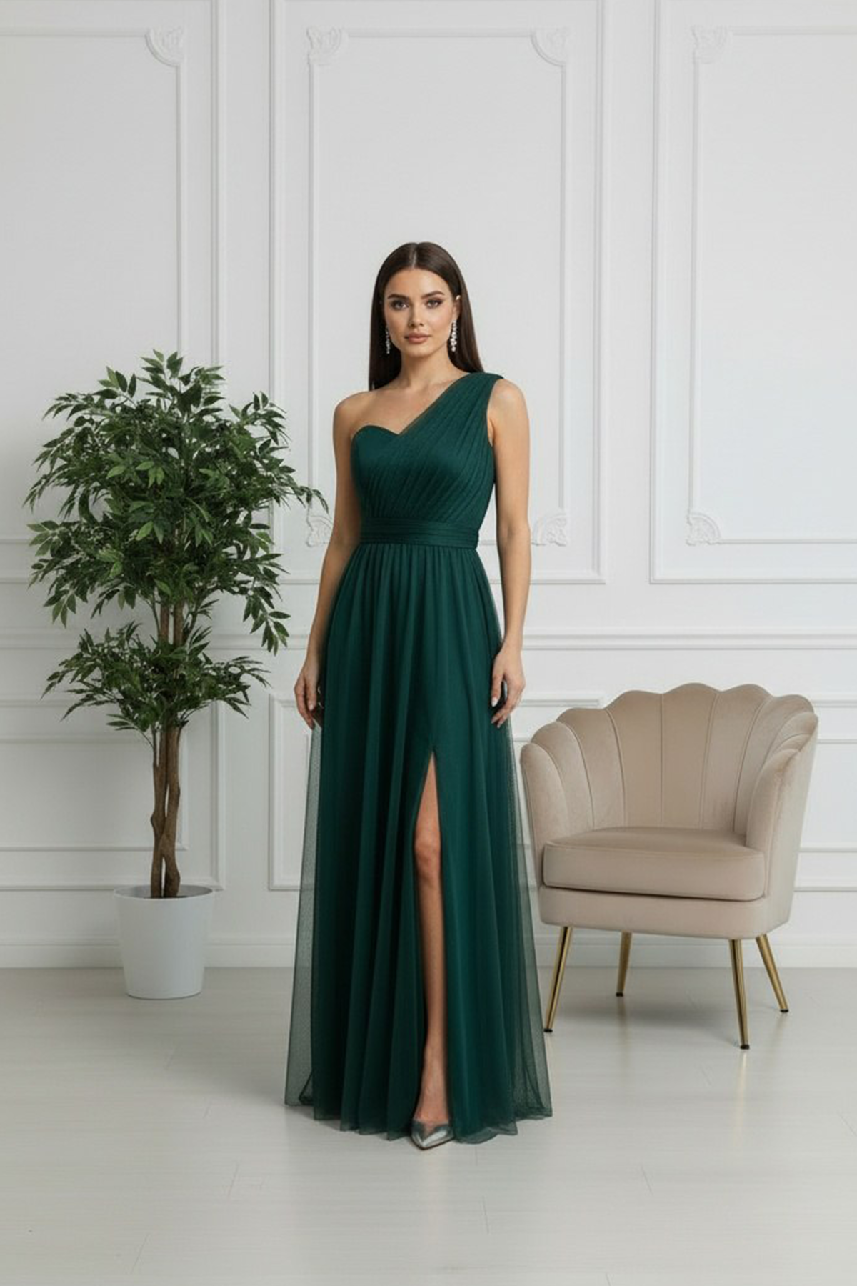 Questo raffinato modello monospalla in tulle cattura l'essenza della femminilità sofisticata. La spalla scoperta crea un effetto sensuale, mentre il tessuto fluido garantisce movimento naturale e comfort durante la serata. Perfetto per matrimoni, gala e occasioni speciali dove desideri fare un'impressione indimenticabile. Un capolavoro di stile che trasforma ogni momento in un'occasione memorabile.