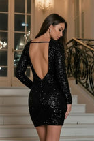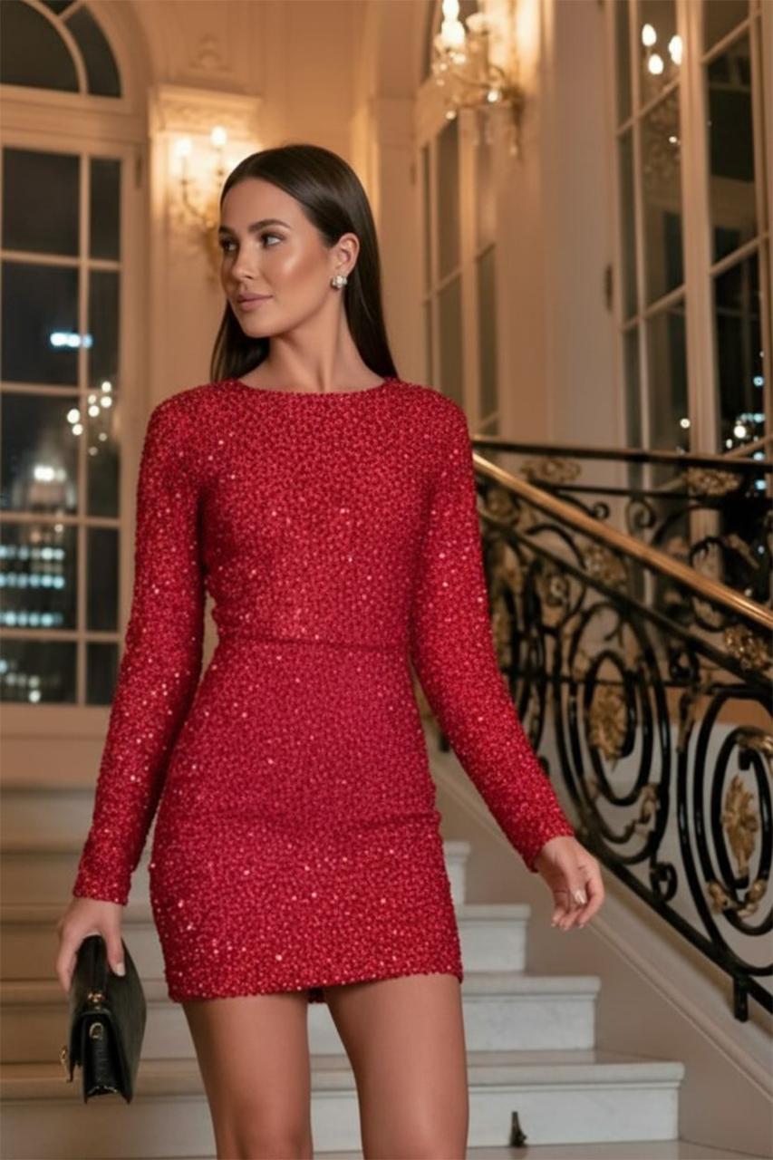 Questo tubino affascinante è interamente ricoperto di pailettes che catturano la luce con ogni movimento, creando un effetto luminoso straordinario. La schiena scoperta rivela sensualità sofisticata, mentre la lunghezza sopra il ginocchio garantisce un'allure moderna e raffinata.