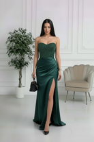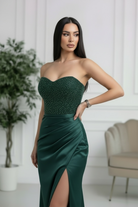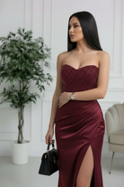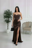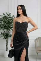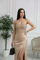 Questo raffinato abito da cerimonia combina un top scintillante in paillettes che cattura la luce con una gonna fluida caratterizzata da uno spacco laterale sensuale.
