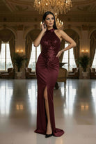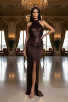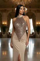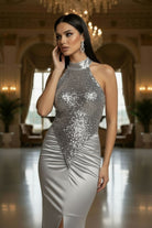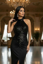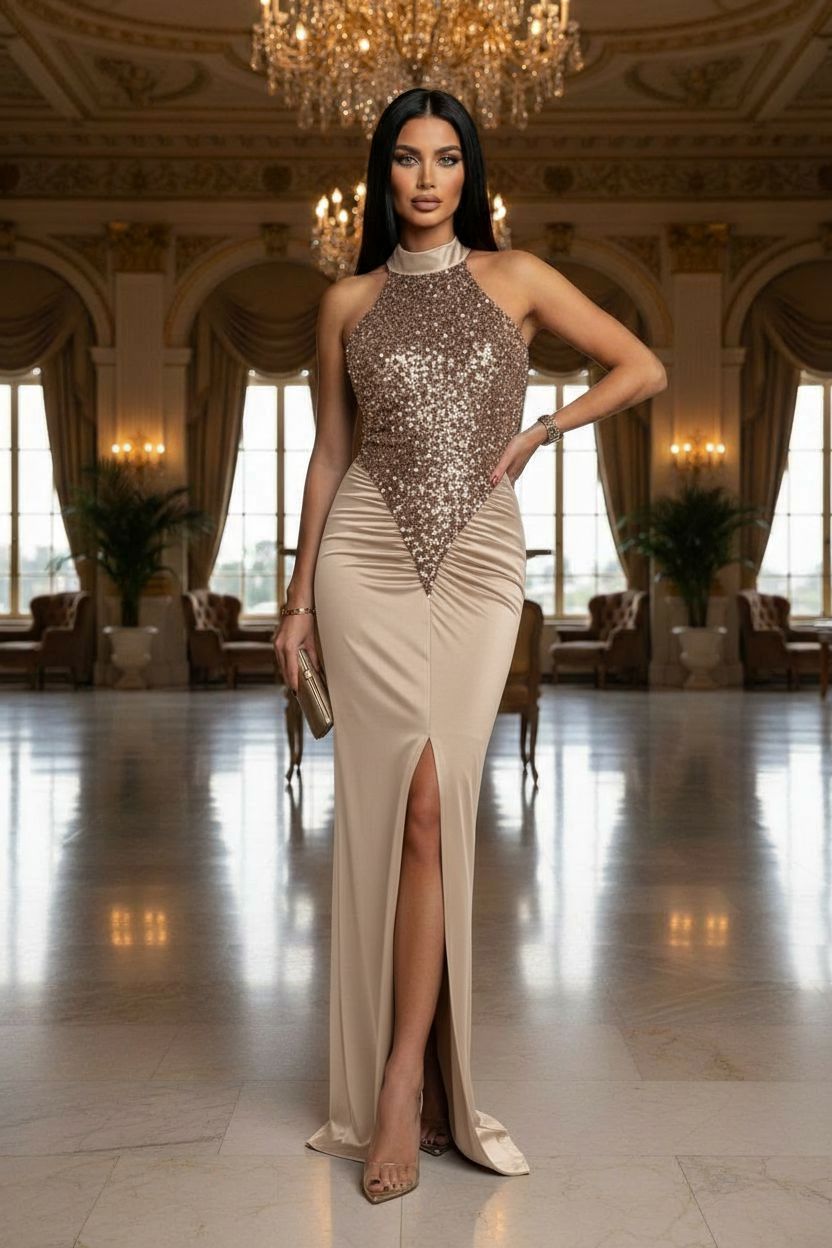 Eleganza sofisticata che esalta la femminilità. La parte superiore in paillettes cucite a mano cattura la luce con un effetto luminoso affascinante, mentre la gonna morbida con drappeggio strategico ai fianchi crea una silhouette formosa e slanciata. Un capo che unisce sensualità e raffinatezza, perfetto per occasioni speciali dove desideri brillare con stile e sicurezza.