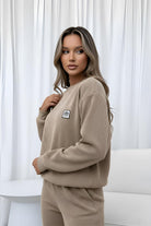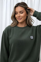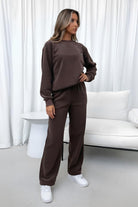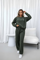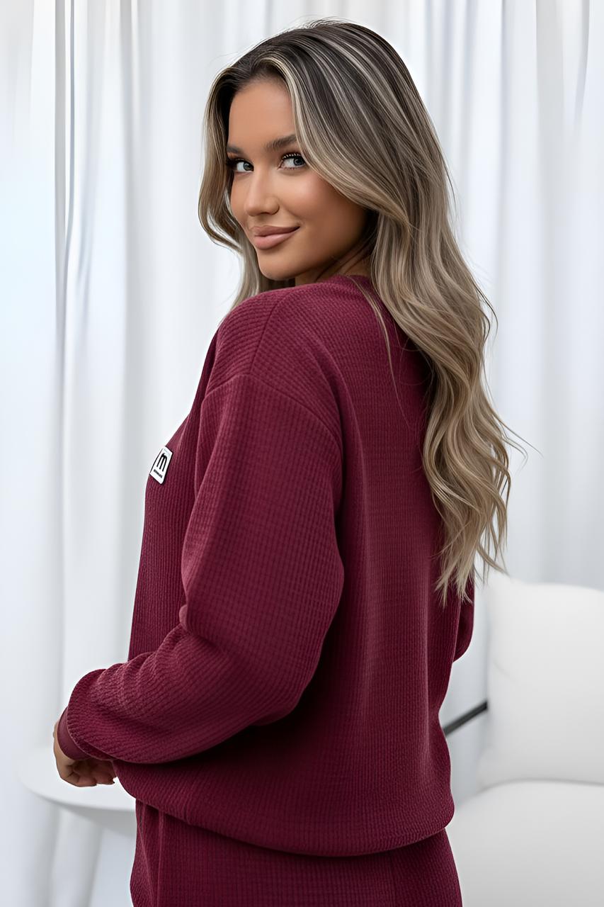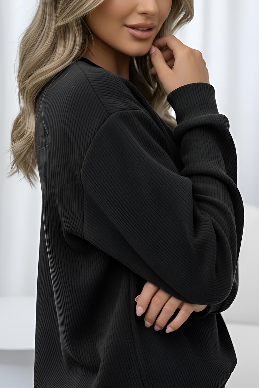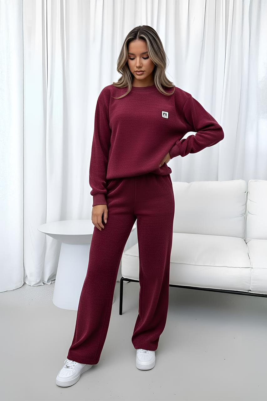 La felpa dal taglio rilassato si abbina ai pantaloni a gamba larga, creando una silhouette moderna e minimal.