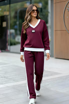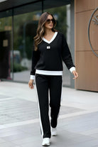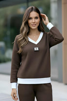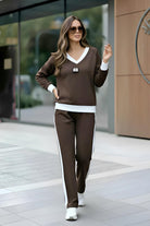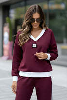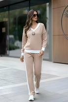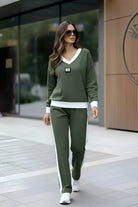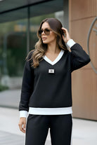 La felpa con scollo a V valorizza la silhouette senza rinunciare alla comodità, mentre i pantaloni con coulisse regolabile e polsini alla caviglia offrono una vestibilità ideale per il tempo libero o le giornate dinamiche.