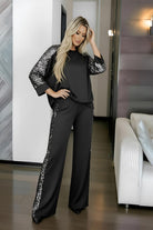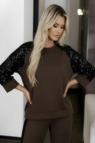 Questa tuta con applicazioni di paillettes unisce comfort e femminilità in un unico capo. Il completo è composto da una felpa con maniche decorate da paillettes e da pantaloni ampi con dettagli coordinati lungo le gambe, per un effetto luminoso e chic.