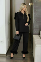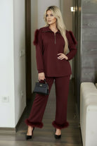 Eleganza sofisticata che cattura l'essenza dello stile contemporaneo. Questa collezione versatile combina una maglia impreziosita da delicate piume con un pantalone che presenta lo stesso dettaglio raffinato alle caviglie.