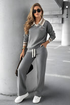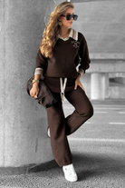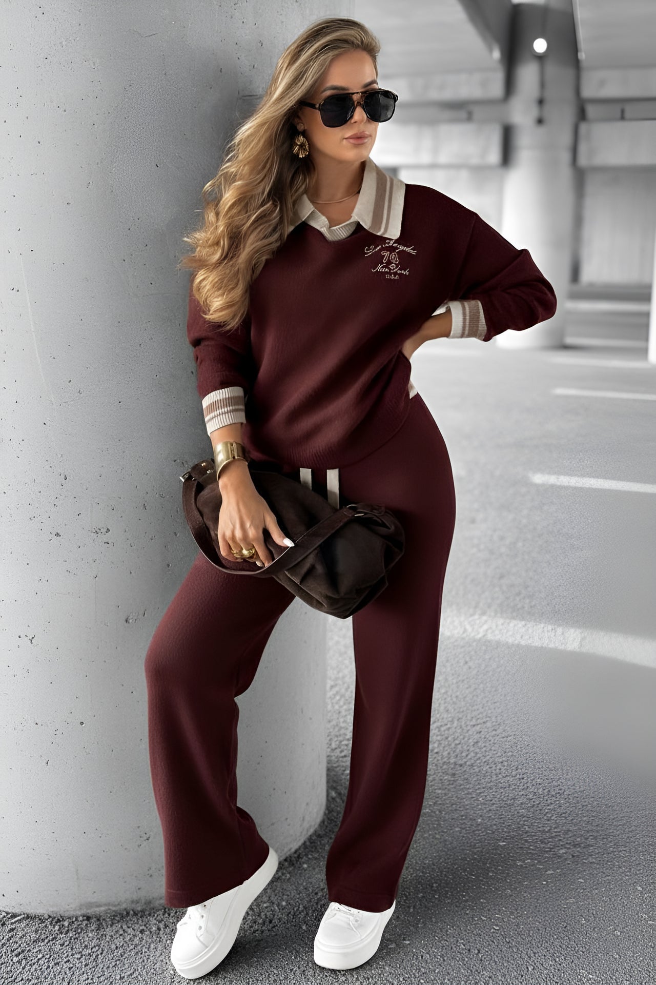 Il perfetto equilibrio tra comfort e stile urbano. Questo coordinato in maglia con colletto a contrasto unisce la morbidezza di un outfit cozy al mood sportivo e deciso dello street style.