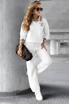 La maglia presenta dettagli ricamati sul petto e polsini a righe, per un tocco college super trendy. I pantaloni a gamba larga accompagnano il movimento in modo fluido e valorizzano la silhouette senza costringere.