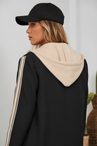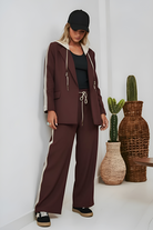La giacca, con cappuccio interno a contrasto e bande laterali, aggiunge un tocco casual e raffinato, mentre i pantaloni ampi con coulisse in vita offrono una vestibilità comoda e versatile.