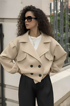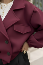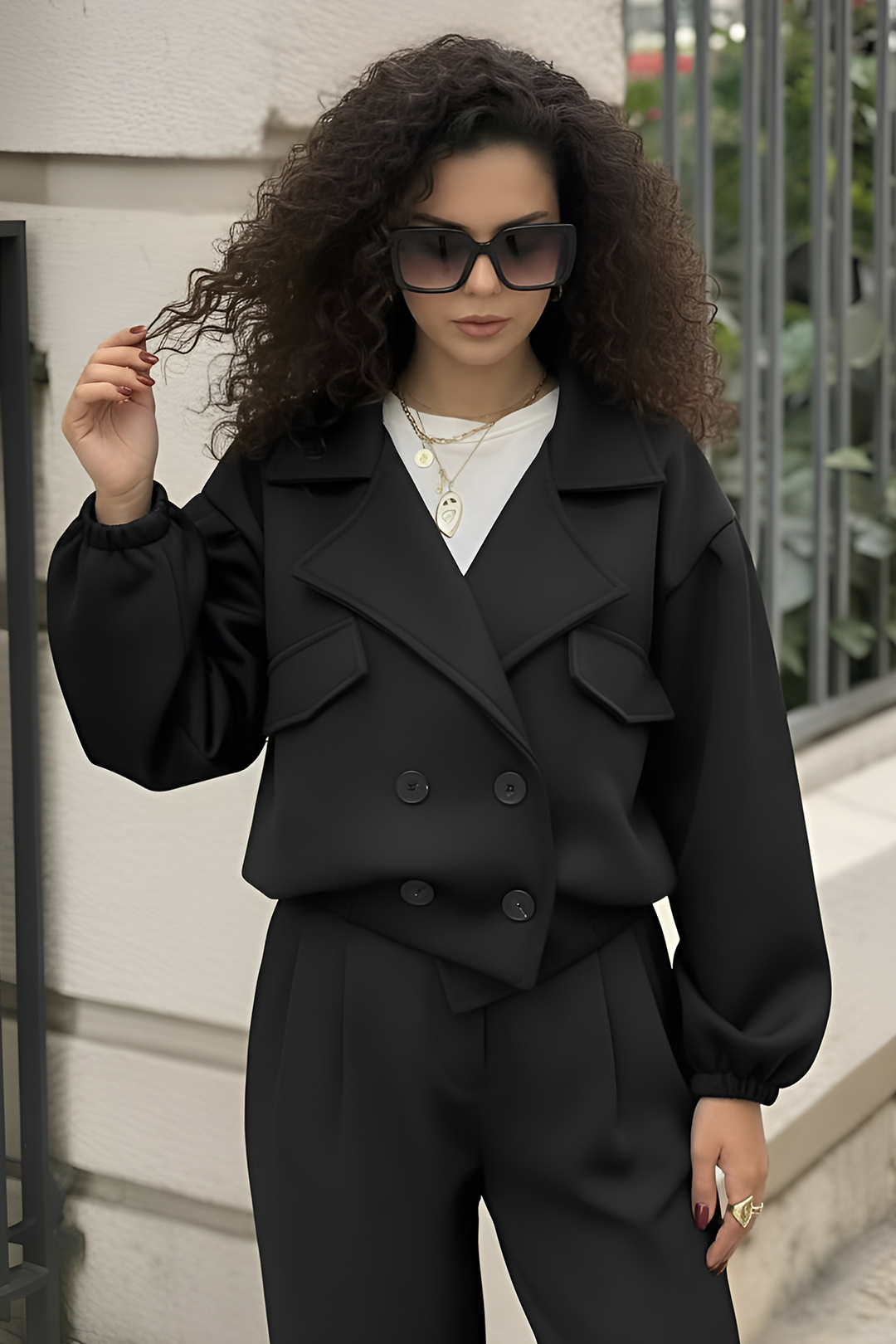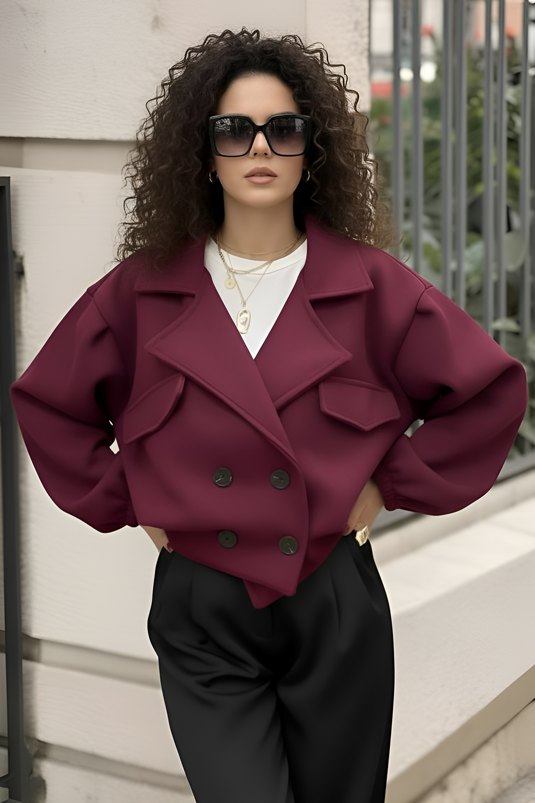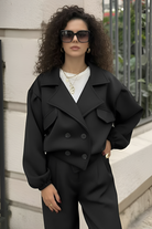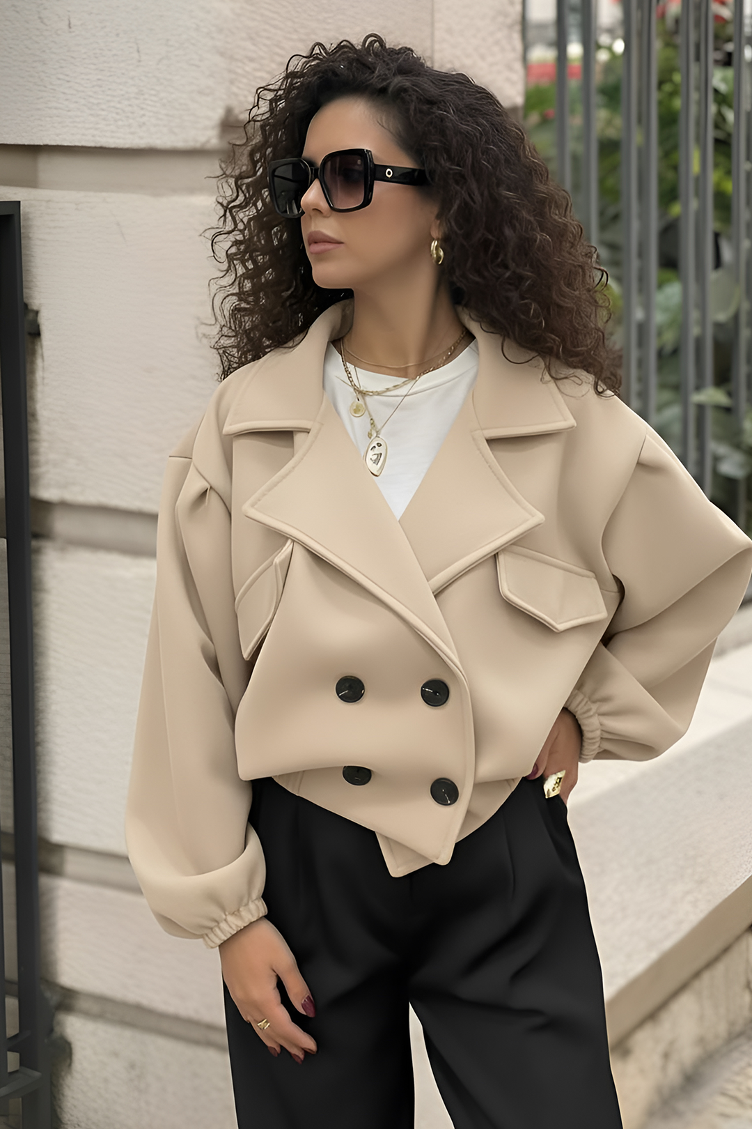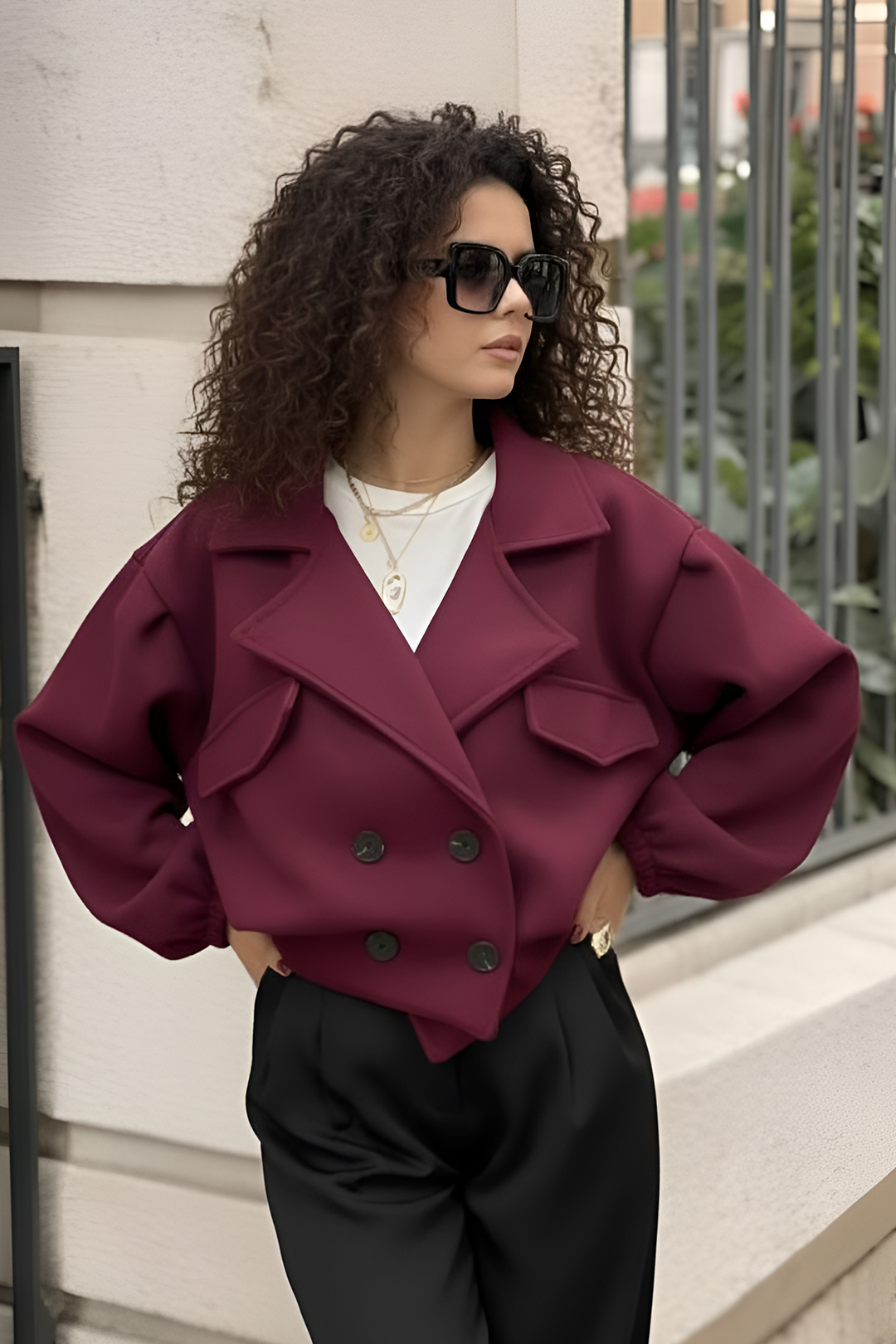 Questa giacca corta doppiopetto è realizzata in tessuto effetto neoprene, che garantisce struttura e comfort al tempo stesso. Il suo taglio oversize e moderno valorizza la figura e si abbina facilmente sia a look casual che più eleganti.