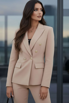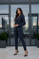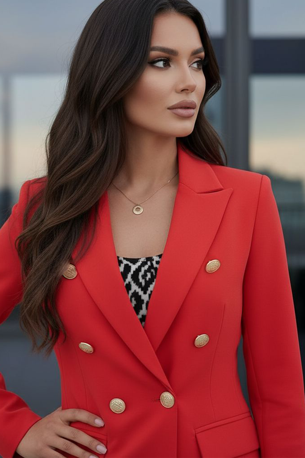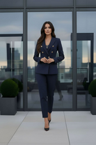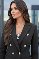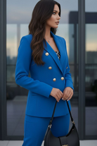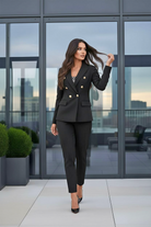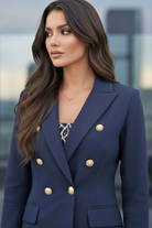 La giacca classica, completamente foderata, sfoggia bottoni in oro che catturano la luce e si rispecchiano nei dettagli al polso, creando un'armonia sofisticata.