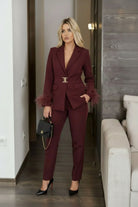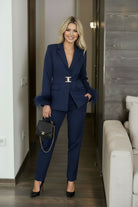 La giacca classica, completamente foderata, sfoggia un dettaglio in color oro come chiusura centrale della giacca. Manica con delle morbide piume al polso che donano eleganza e movimento.