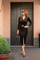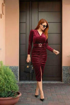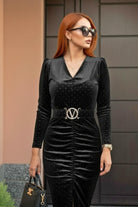 Eleganza senza compromessi. Questo abito affascina con uno scollo a V che valorizza il décolleté, mentre la cintura al girovita definisce la silhouette con precisione.