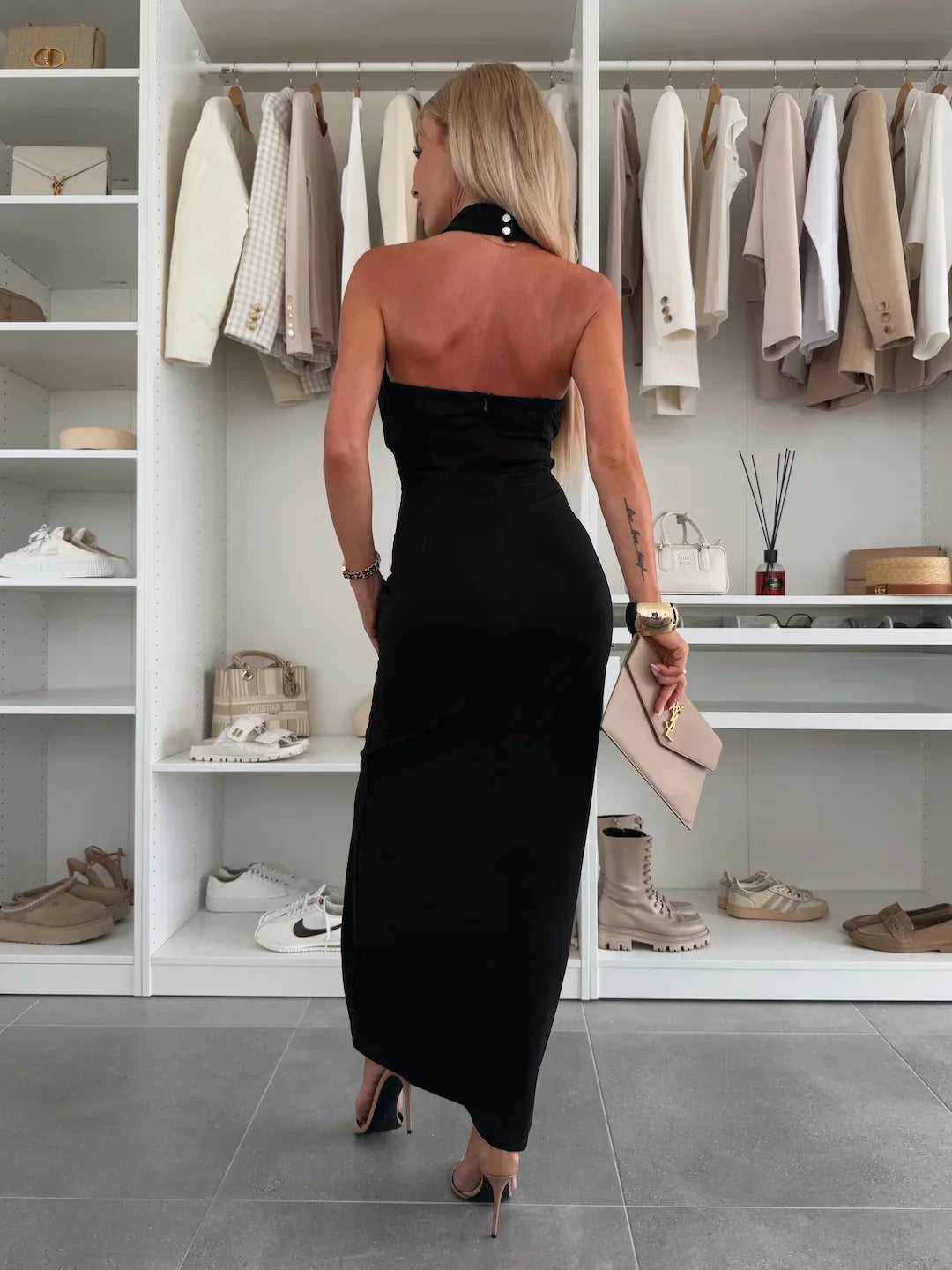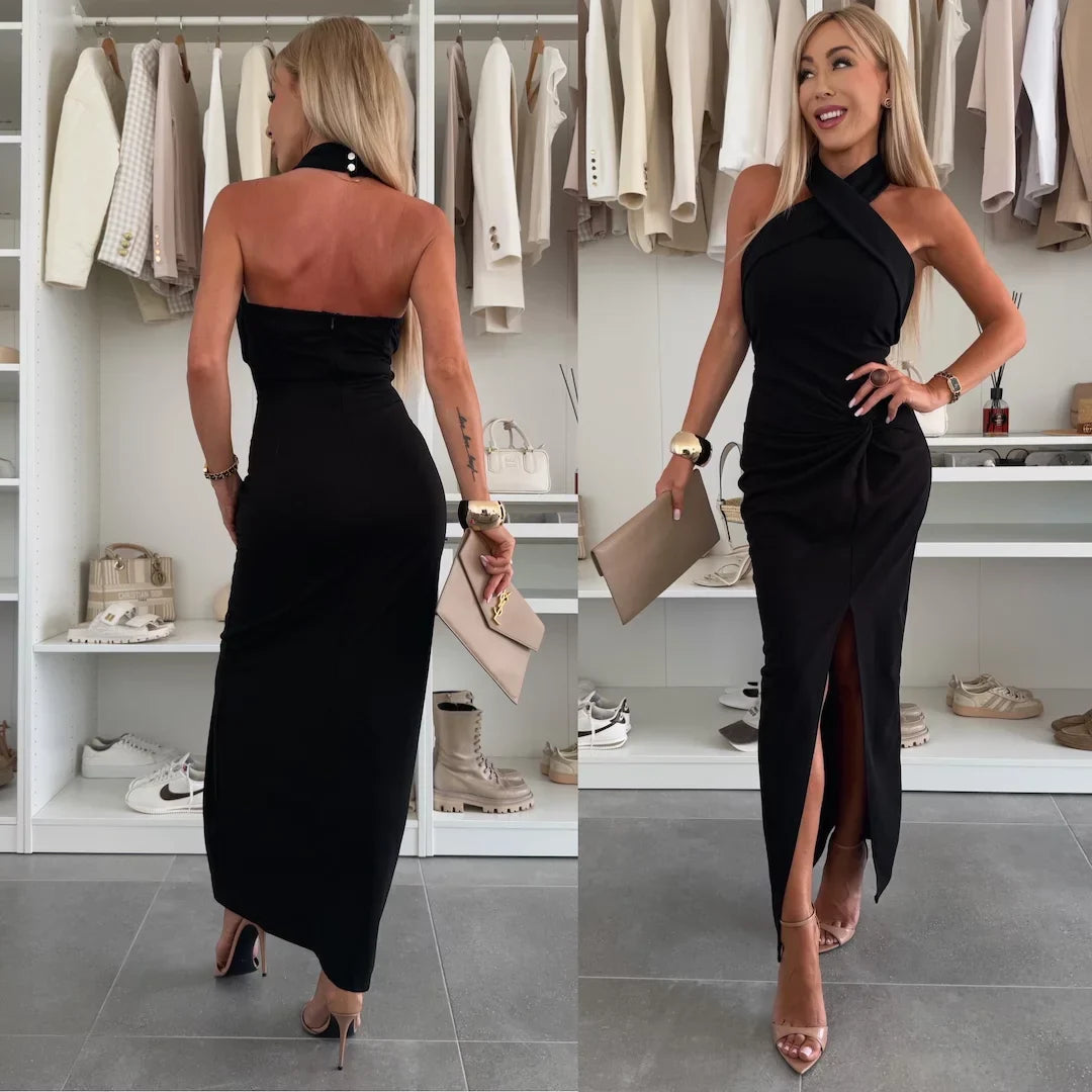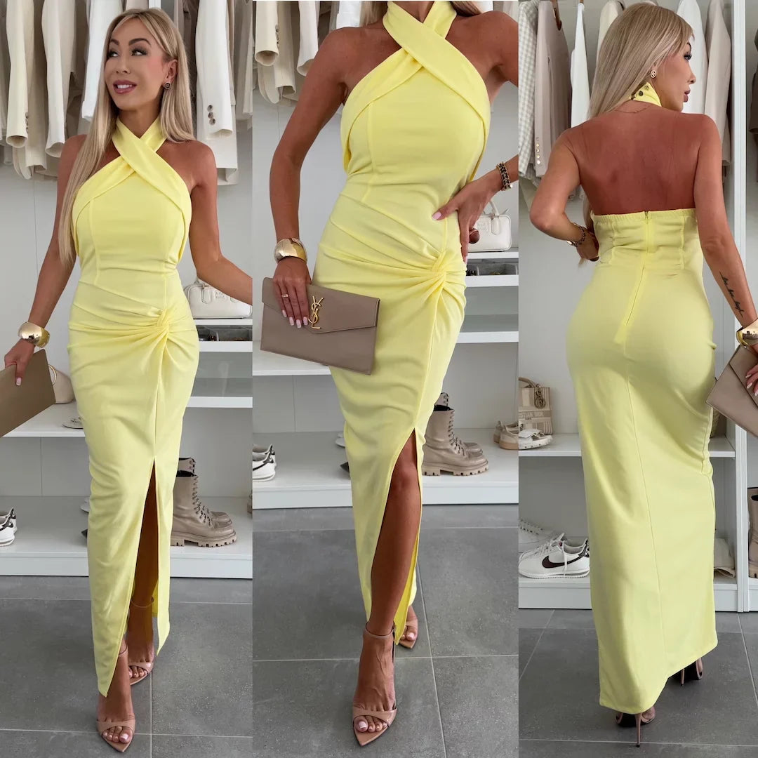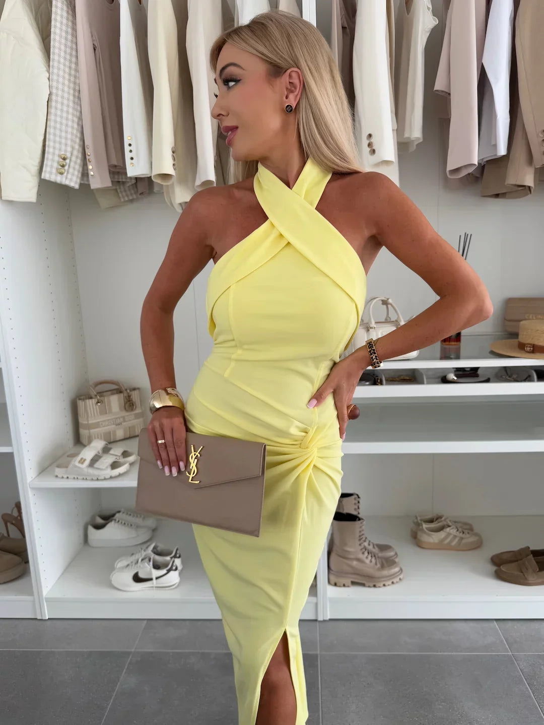 Il dettaglio arricciato laterale con drappeggio esalta il punto vita, mentre lo spacco laterale aggiunge sensualità e movimento. Completano il look le spalline incrociate e la chiusura posteriore discreta, per una vestibilità impeccabile.