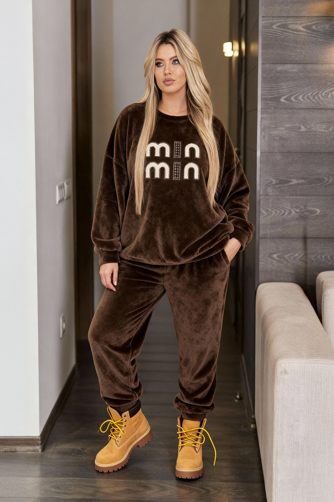 Il top presenta una felpa con dettagli gioiello frontali, che aggiunge un tocco luminoso e femminile, mentre i pantaloni hanno un fit rilassato con elastico in vita per adattarsi perfettamente a ogni silhouette.